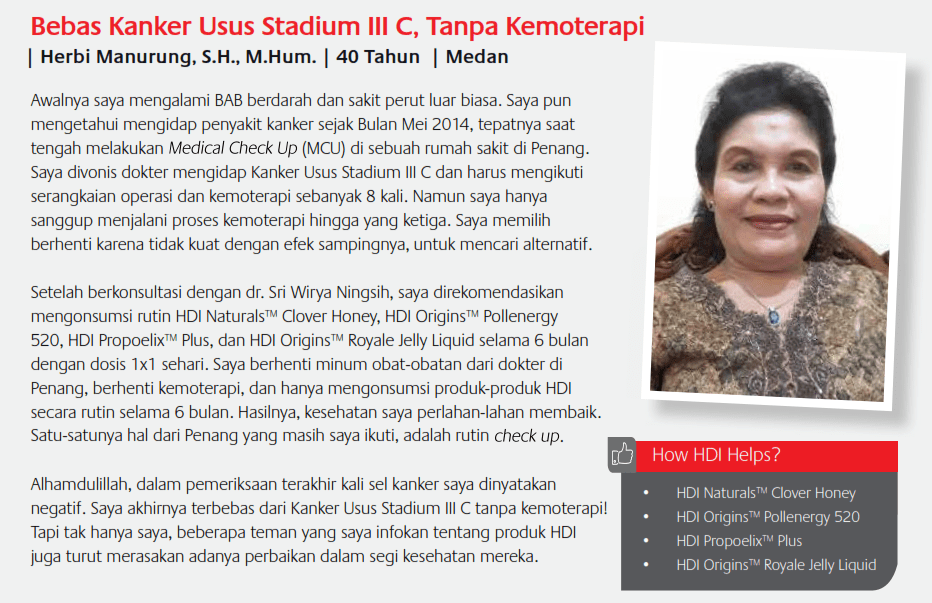 PERTAMA DAN SATU-SATUNYA DI DUNIS. Suplemen Premium Anti Kanker. Ditemukan kombinasi terbaik dan sinergis: PROPOELIX-LINGZHI-MAITAKE-SHITAKE. Sangat Baik untuk yang bergaya hidup sibuk, kurang tidur, stress dan terpapar polusi. Membantu mereka yang memiliki penyakit autoimun maupun pasien kanker yang menjalani kemoterapi.